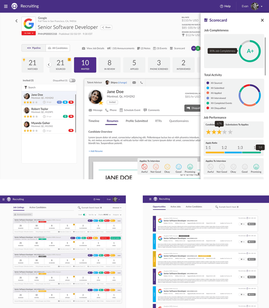 The dashboard functions as the central hub for interactions, catering to a variety of users, including recruiters, hiring managers, and candidates. I crafted an intuitive, visually organized dashboard that streamlined navigation and prioritized key tasks for each user type. Clear visual hierarchy, thoughtful grouping of features, and a clean interface allowed users to quickly access what mattered most.